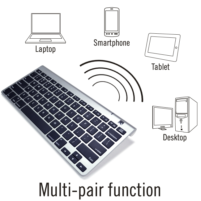 WKB-803A, is at the forefront of cutting edge wireless keyboard with multi-host switchable feature (patented). It is an ideal wireless keyboard for using iMac, iPad, iPhone or other Android OS Tablets in between, thanks to multi-host switchable feature. This compact size keyboard comes equipped with Bluetooth 3.0 technology with 2 x AA batteries, scissor-type key mechanism among many other features.